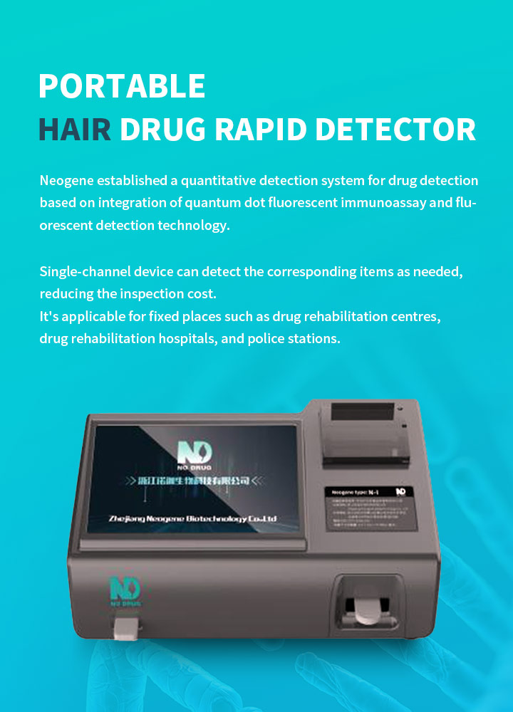 Rapid drug testing products are developed by ND independently. Passing rigorous inspections, ND products are approved by Ministry of Public Security and Police Electronic Product Quality Testing Centre.the company's self-developed hair drug detection technology and products are in leading positions in the market. The handy, easy-operated handheld and portable hair drug testing devices are easy to take samples, and can adapt to various testing environments. Multiple drugs can be detected, such as heroin, morphine, methamphetamine, ketamine etc. The reagent kit can be stored at normal temperature, thus, convenient for transportation and storage. The equipment is with supreme functioning quality, for instance, fast detection speed (within 5 minutes), high detection sensitivity (0.2ng/mg, in line with the standard of Ministry of Public Security), and strong thermal stability (tolerance to 45 °C).